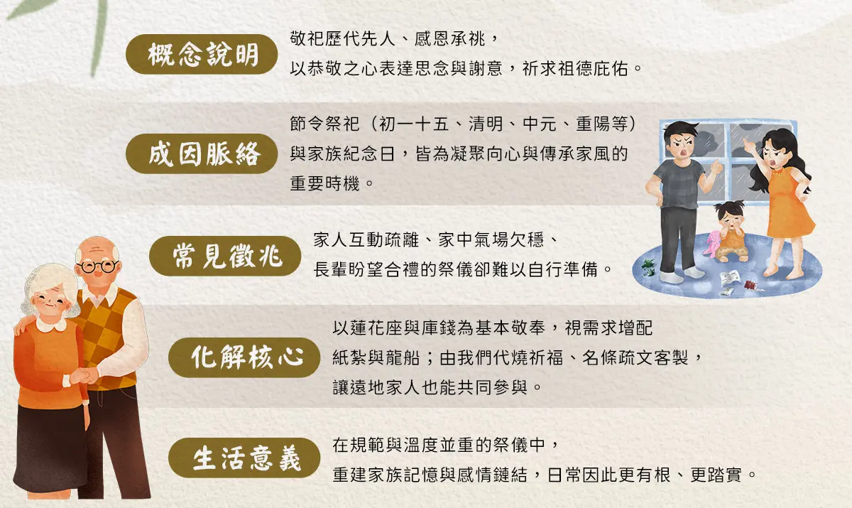 家人互動疏離、家中氣場欠穩、長輩盼望合禮的祭儀卻難以自行準備。