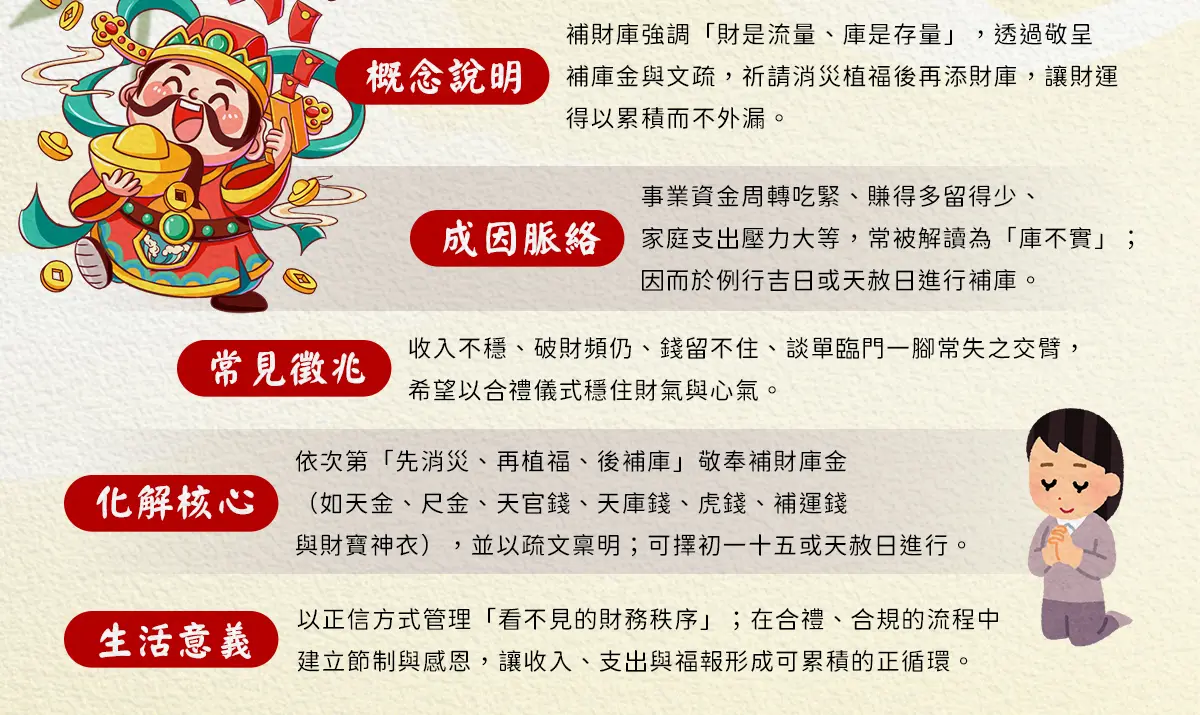 「補財庫」是道教及民間信仰中的重要科儀,象徵修補個人命中財庫的漏洞,讓財氣能進不漏。人生中若常有「錢來得快、去得也快」、「明明努力卻留不住財」的情況,便屬「有財無庫」;反之,若生活平順卻遲遲無法增加收入,則屬「有庫無財」。透過補財庫法會,向玉皇大帝、財神爺、三官大帝祈求補運補庫,能讓財源穩固、福氣延續、運勢轉旺。