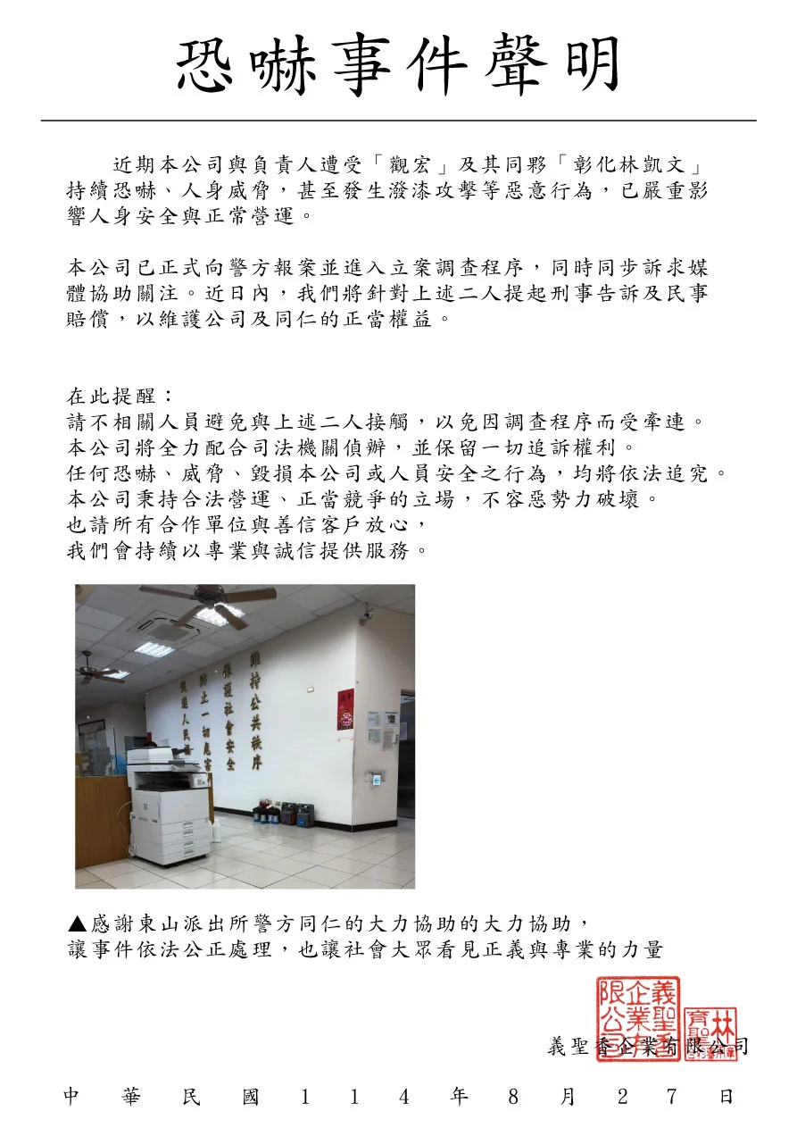 近期,義聖香企業有限公司與本公司負責人接連遭受「觀宏」及其共犯「彰化林凱文」的持續恐嚇與人身威脅,並已發生潑漆等蓄意攻擊毀損事件,手段惡劣、情節嚴重,已嚴重影響公司內部人員安全與營運秩序。